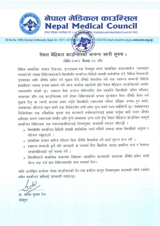 नेपाल मेडिकल काउन्सिलले सामाजिक सञ्जालमार्फत औषधि र उपचारसम्बन्धी सल्लाह दिने चिकित्सकहरूलाई सचेत गराएको छ ।